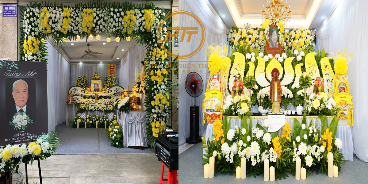 - Chúng tôi đảm nhận toàn bộ việc chuẩn bị các vật phẩm cần thiết như quan tài, vòng hoa vĩnh biệt, nhang đèn, trang phục và phướn điếu, đảm bảo đầy đủ và chỉn chu.