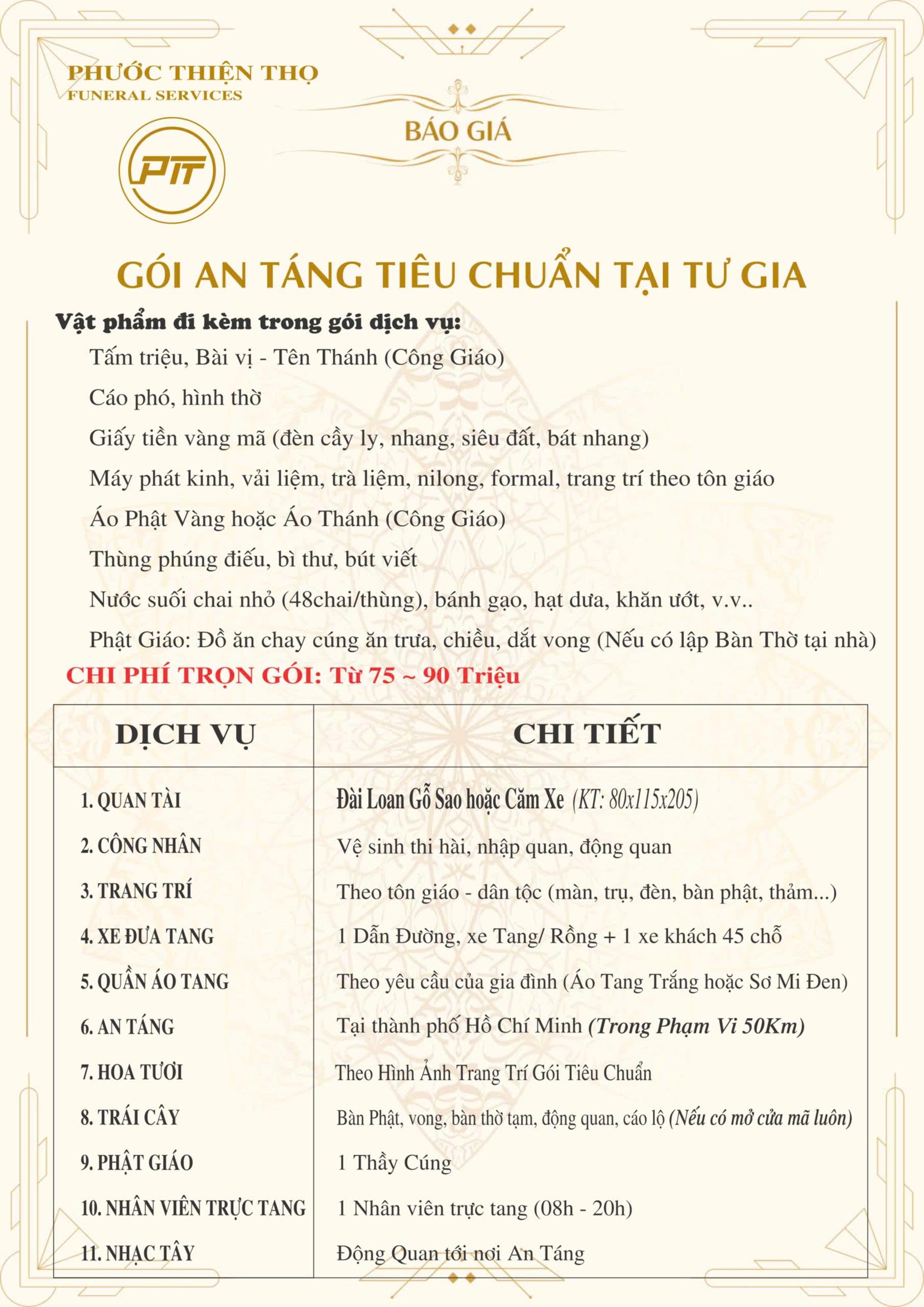 Để minh bạch và giúp gia đình dễ dàng hình dung, Phước Thiện Thọ cung cấp khung giá cho các gói dịch vụ tang lễ chính.