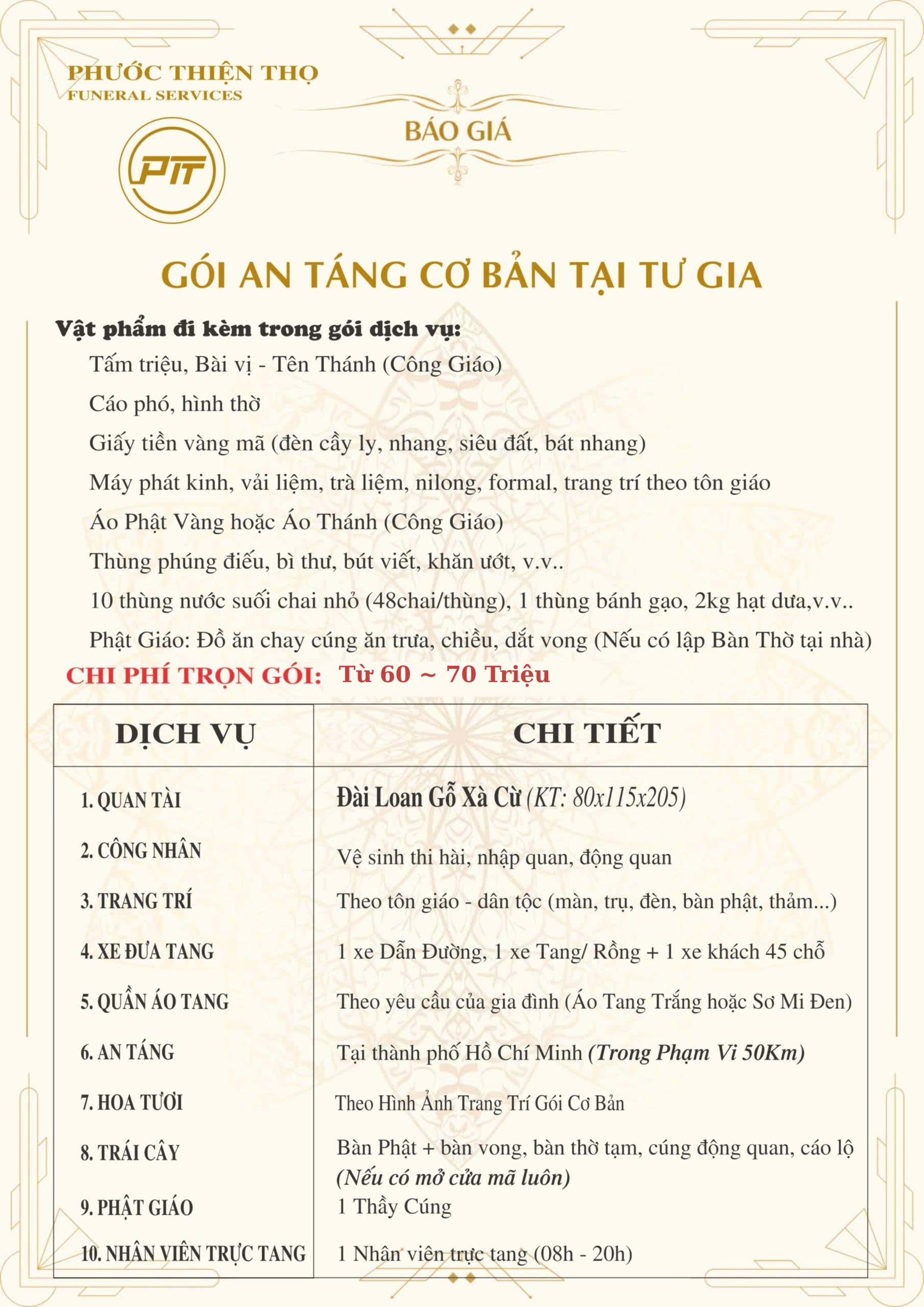 Phước Thiện Thọ cung cấp dịch vụ tang lễ trọn gói tại quận Tân Bình, với nhiều lựa chọn phù hợp với nhu cầu và khả năng tài chính của từng gia đình. Dưới đây là bảng giá cho các gói dịch vụ mà chúng tôi cung cấp, nhằm giúp quý vị dễ dàng tham khảo và đưa ra quyết định phù hợp.